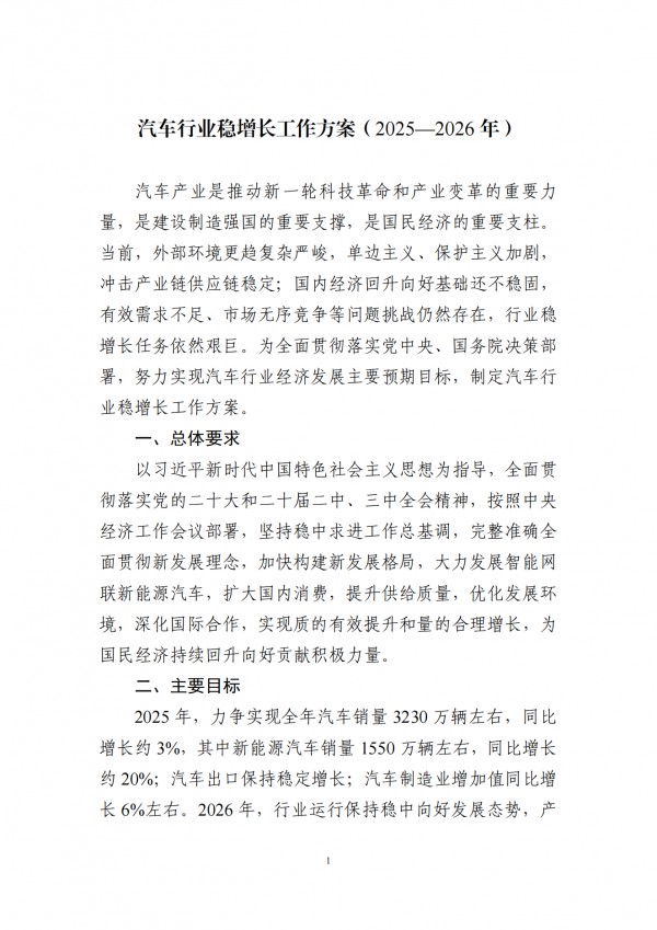 現(xiàn)將《汽車行業(yè)穩(wěn)增長工作方案(2025—2026年)》印發(fā)給你們,請(qǐng)結(jié)合實(shí)際認(rèn)真抓好落實(shí)。