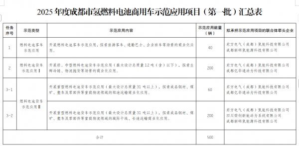 近日,成都市經(jīng)信局市新經(jīng)濟委公示了擬承擔2025年度成都市氫燃料電池商用車示范應用項目(第一批)的示范應用聯(lián)合體牽頭企業(yè)名單。名單顯示,成都今年首批擬投放示范應用氫燃料電池商用車500輛,示范應用場景包括旅游客車、通勤巴士、企業(yè)班車,涵蓋成品鋼材等重載物流領域的短途運輸及城際干線、長途運輸。