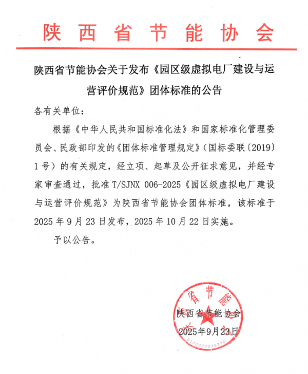 9月23日,由陜西省節(jié)能協(xié)會正式批準發(fā)布的團體標準T/SJNX 006-2025《園區(qū)級虛擬電廠建設與運營評價規(guī)范》正式發(fā)布。此項標準由西安廣林匯智能源科技有限公司聯(lián)合國能(陜西)能源銷售有限公司、中電建西北售電有限公司、西安工程大學、西北工業(yè)大學、西安電子科技大學、西安交通大學等17家產學研單位共同起草完成。